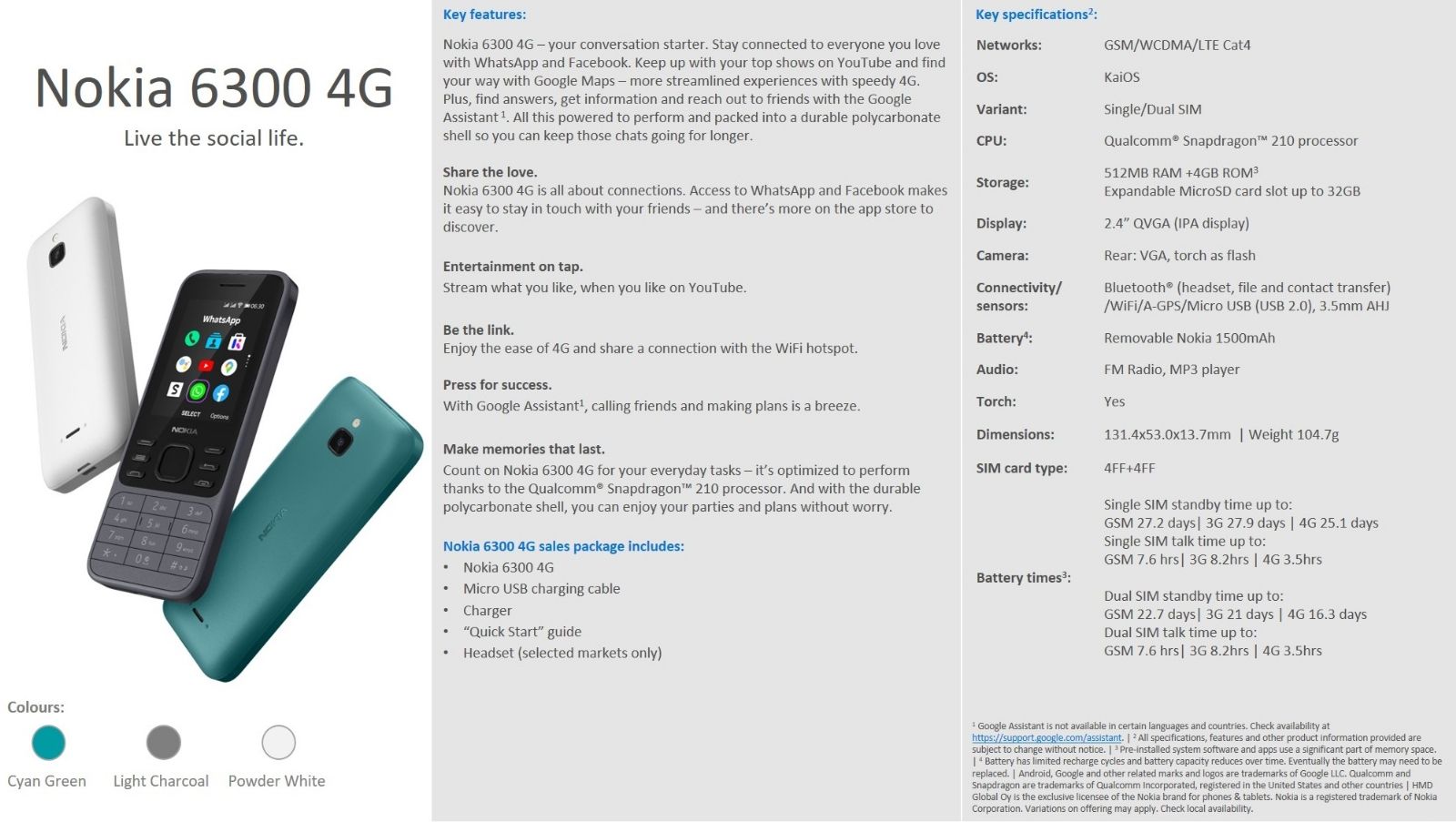 El Nokia 6300 4G viene en colores blanco, carbón claro y verde cian, mientras que el 8000 4G tiene opciones de oro citrino, negro ónix, azul topacio y blanco ópalo.