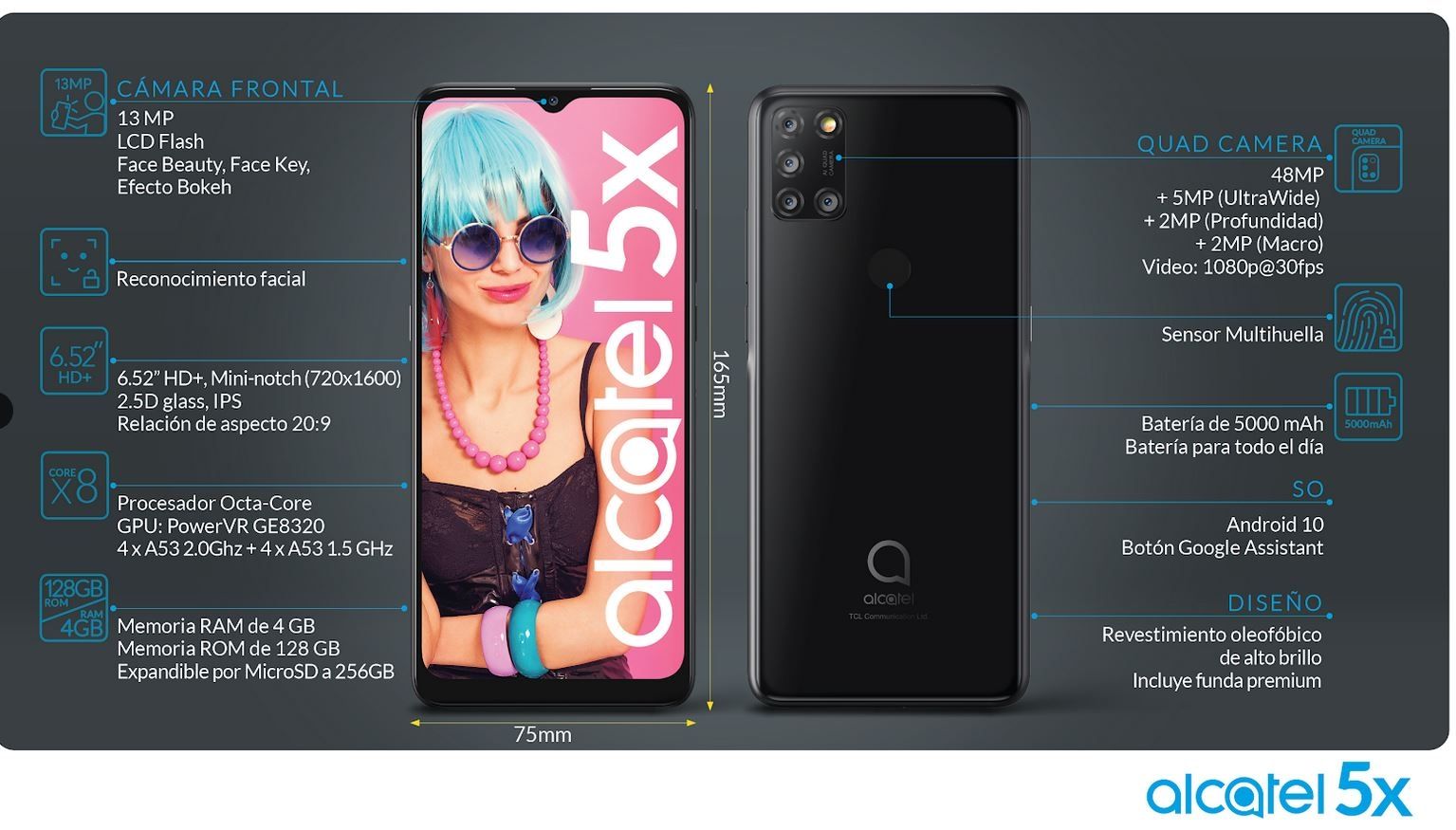 Además el nuevo teléfono inteligente de Alcatel posee una pantalla de 6.5 pulgadas, procesador Octa Core, que soporta multitareas con memoria interna de 128GB y un Ram de 4GB que garantizan una experiencia rápida y fluida.