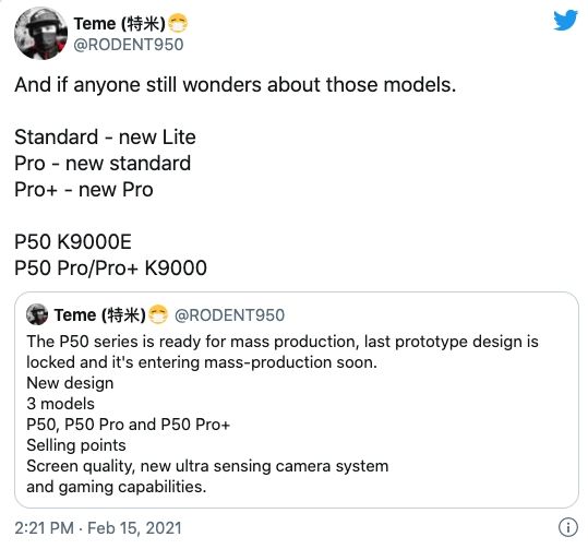 El filtrador de Twitter @RODENT950 dio información sobre la llegada del móvil Huawei P50 En otro tweet, también compartió algunos otros detalles, diciendo que la gama Huawei P50 está a punto de entrar en producción en masa y que tiene un nuevo diseño.