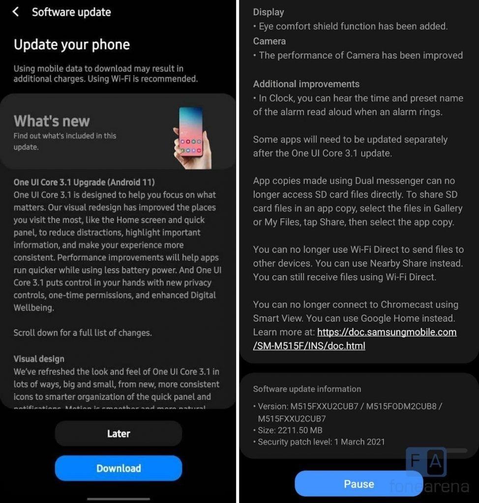 Como en los demás dispositivos, Samsung adelantó esta actualización ya que estaba prevista para abril. Según los usuarios poseedores de este modelo, el update tiene el número de serie M515FXXU2CUB7 y su peso es de 2,21 GB, así que es mejor usar WiFi a la hora de instalarla, en el caso de tener una tarifa de datos limitada. Junto a la actualización se lanza el parche de seguridad de marzo de 2021.