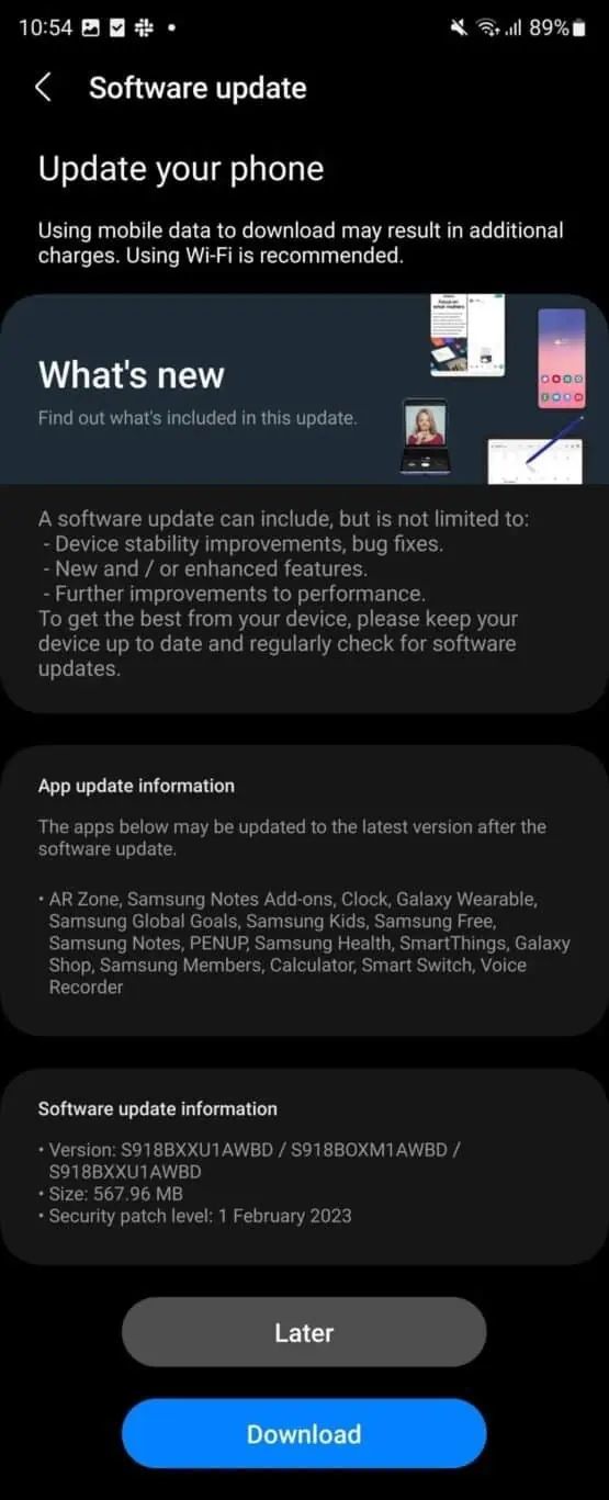 Si estás actualizando desde un Galaxy, probablemente conozcas el ejercicio cuando se trata de instalar actualizaciones. Pero si eres nuevo en el ecosistema de Samsung, déjanos decirte cómo, ya que es un proceso bastante simple. En la mayoría de los casos, recibirás una notificación una vez que el lanzamiento de OTA (por aire) llegue a su unidad Galaxy S23. Simplemente toque la notificación y siga las instrucciones en pantalla para completar el proceso de actualización.