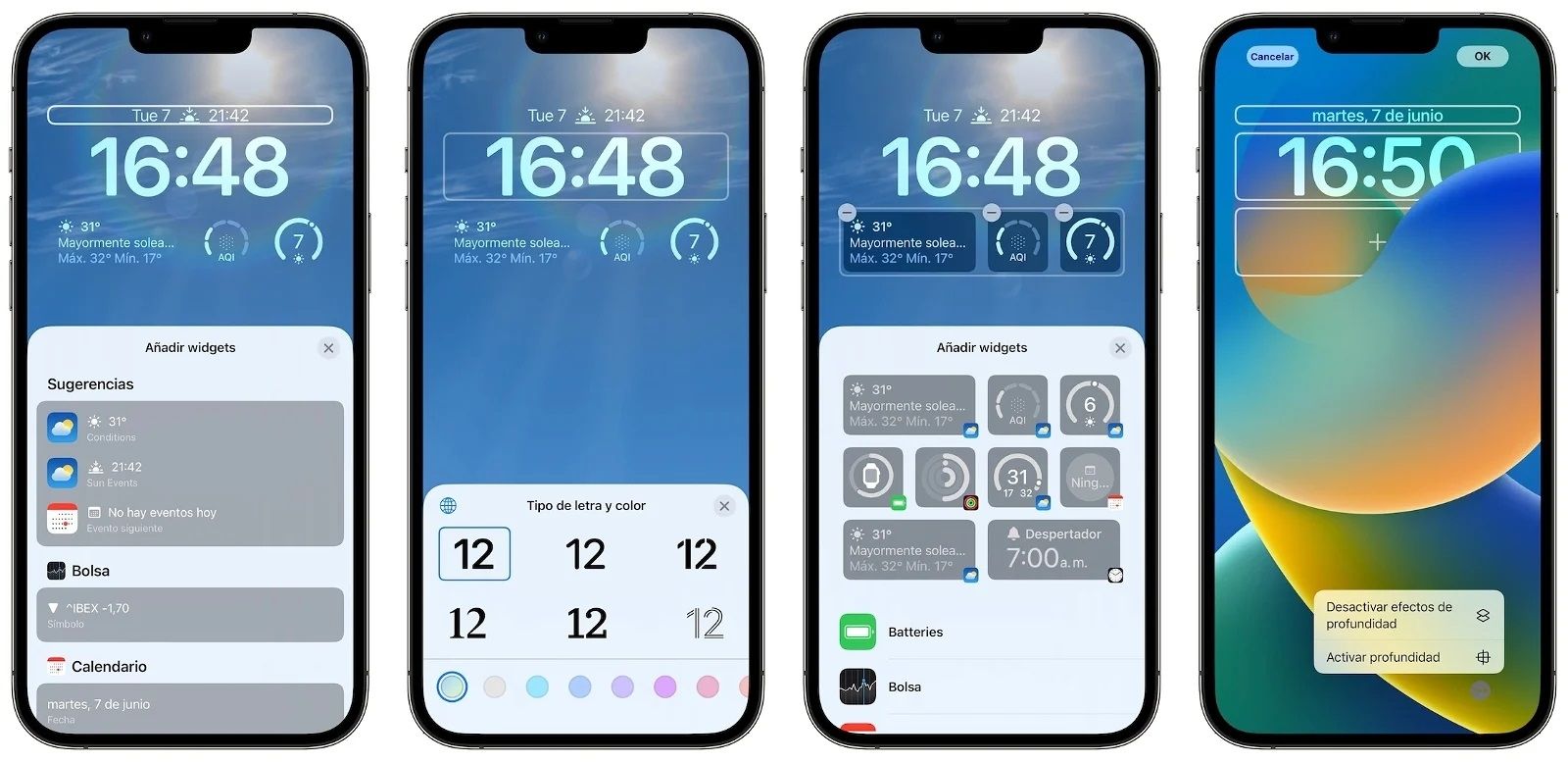 En la pantalla de bloqueo de iOS 16 puedes personalizar la tipografía y el color de la hora y la fecha. Para hacer esto, mantén presionada la pantalla de bloqueo y luego toca "Personalizar" y selecciona la opción de "Fecha". Allí podrás elegir entre 8 opciones de fuentes diferentes y deslizar hacia abajo para encontrar el color que mejor se adapte a tu fondo de pantalla de tu iPhone.