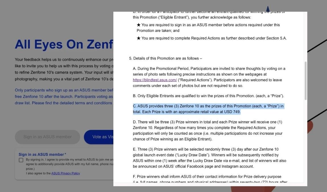 El sitio web de ASUS recopila los comentarios de las personas en una serie de fotos que ayudarán a la empresa a mejorar el rendimiento de la cámara del Zenfone 10, las personas que brinden sus comentarios también tendrán la oportunidad de ganar el teléfono, cada premio tiene un valor de venta aproximado de USD 749 lo que sugiere fuertemente que el Zenfone 10 tendrá un precio inicial de USD 749 en los EE. UU.