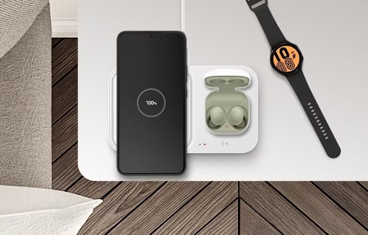 Al ser un cargador dúo, puede cargar su Galaxy S23+, así como su reloj inteligente, o tal vez también sus auriculares. Desafortunadamente, solo puede cargar un teléfono a la vez aquí, ya que el otro cargador secundario es más lento. Y destinado a auriculares o un reloj inteligente.