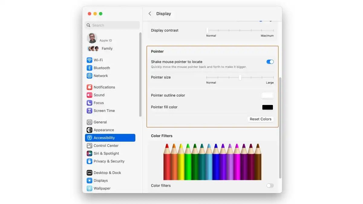 macOS Monterey y Ventura: aquí encontrará dos configuraciones, Color de contorno del puntero y Color de relleno del puntero. Haga clic en el botón de muestra de color junto a cada configuración y aparecerá la paleta de selección de colores. Seleccione los colores que desee. Si desea volver al blanco y negro predeterminados, haga clic en el botón Restablecer.