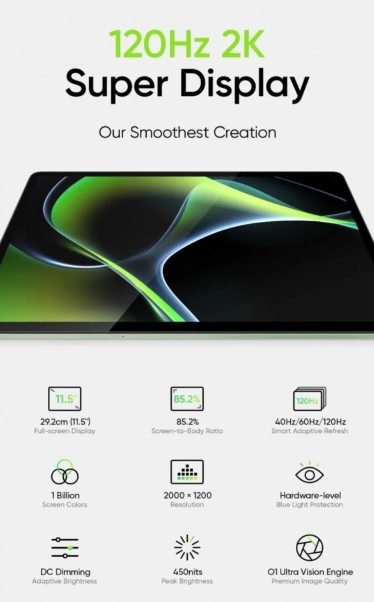 Sin embargo, hay bastantes otros datos que provienen directamente de la página Realme Pad 2 que ya no está disponible. Para empezar, la pantalla de 11,5 pulgadas del Realme Pad 2 tiene una resolución de 2K y una frecuencia de actualización de 120 Hz. Además, el panel admite 10 bits (mil millones de colores) y O1 Ultra Vision Engine para que se vea brillante y colorido. Las imágenes revelan que la pantalla del Realme Pad 2 proporciona un brillo de hasta 450 nits, que es bastante estándar para las tabletas de gama media.