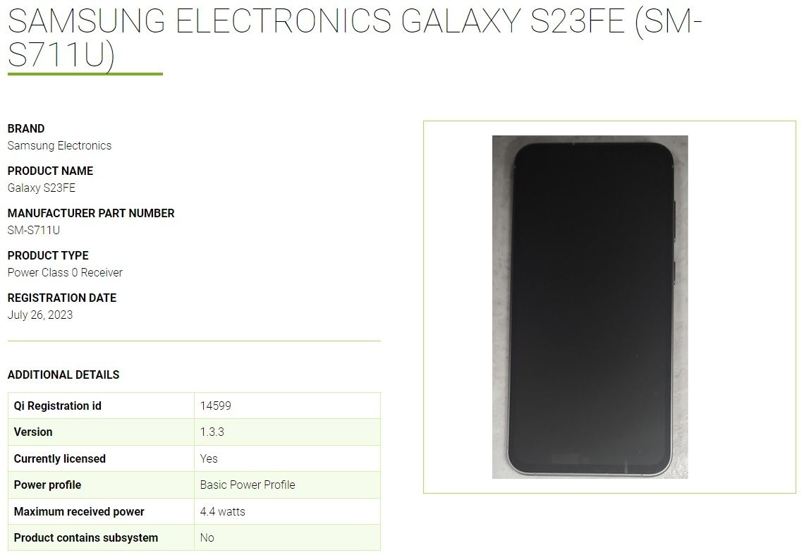 La versión estadounidense del Galaxy S23 FE se vio recientemente en el sitio web de Wireless Power Consortium . No solo se confirmó el nombre y el número de modelo SM-S711U, sino que la aplicación WPC contenía una foto en vivo del Galaxy S23 FE