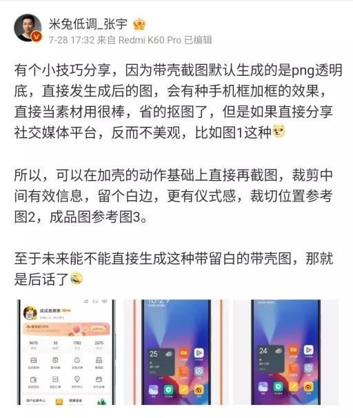 Zhang Yu mencionó que no han considerado agregar la función para incluir automáticamente bordes blancos cuando se aplica el marco de la captura de pantalla, en respuesta a los usuarios que preguntaron sobre dicha función.