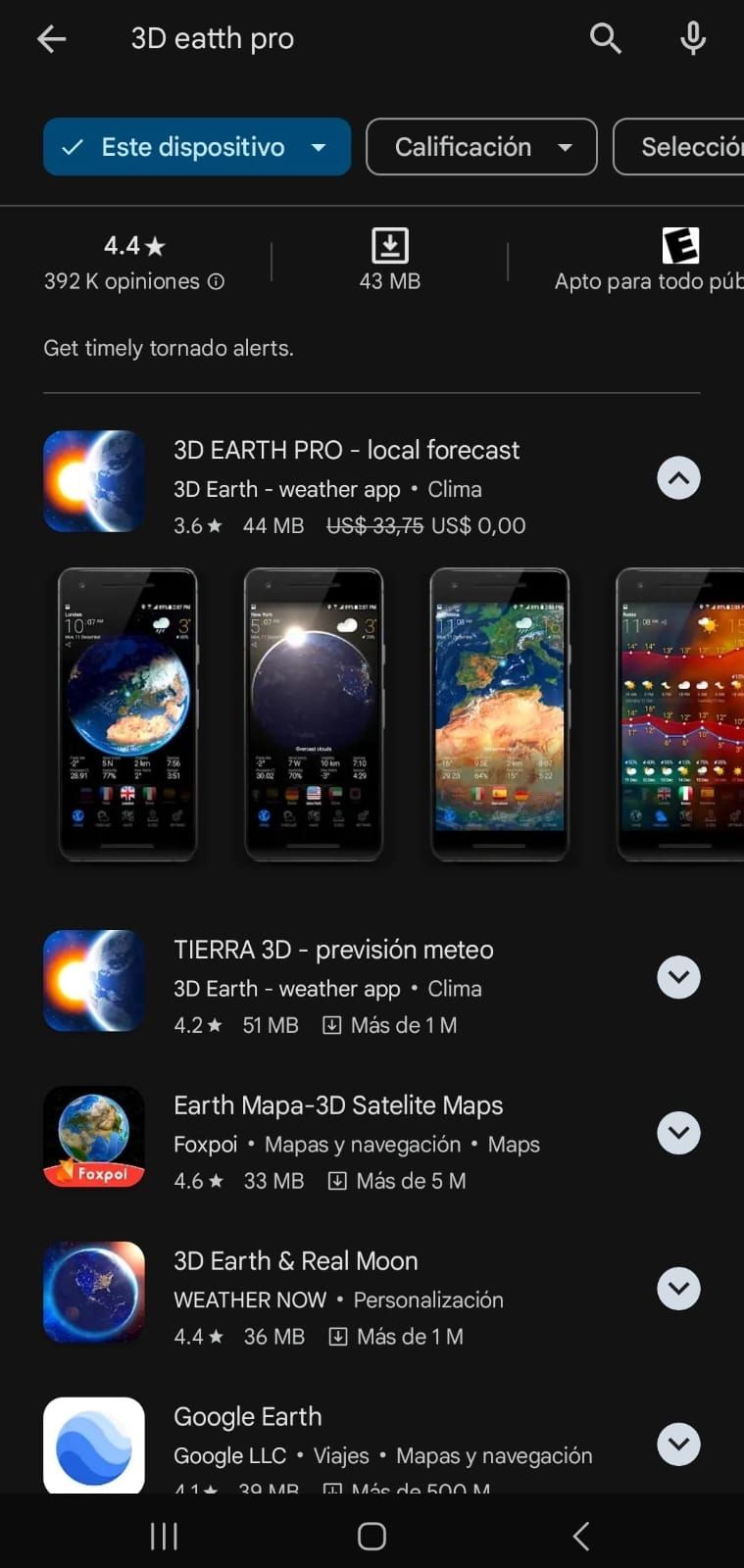 Una de las aplicaciones más descargadas es 3D EARTH PRO, la cual está siendo usada por un millón de usuarios debido a su efectividad para brindar información sobre el estado del tiempo. Esta aplicación generalmente es costosa y tiene un valor cercano a los 33 dólares, pero por tiempo limitado podrás descargarla de forma gratuita.