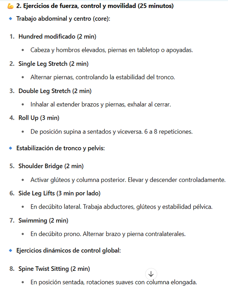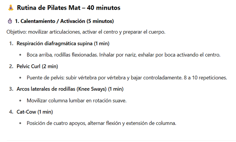 El prompt/orden que le pedimos fue la siguiente: "actúa como profesional de pilates contemporáneos y elabora una rutina de 40 minutos con ejercicios en pilates mat y estiramientos incluidos"