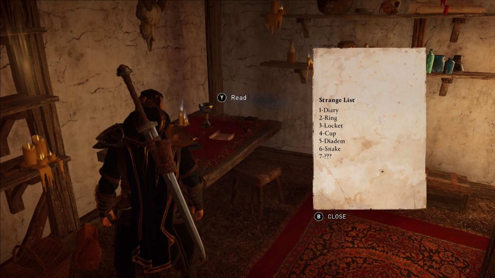En el área londinense de Assassin's Creed Valhalla, los jugadores se encontrarán con una cabaña custodiada por una serpiente. Después de matar a la serpiente, los jugadores podrán entrar a la cabaña y encontrar una extraña lista que tiene siete elementos: Diario, Anillo, Relicario, Copa, Diadema, Serpiente y, por último, un objeto misterioso con la etiqueta '???? '. Por supuesto, los fanáticos de Harry Potter sabrían que estos elementos son referencias a los Horrocruxes en la franquicia, y la razón por la que el último está etiquetado con signos de interrogación porque el séptimo Horrocrux es el mismo Harry Potter.