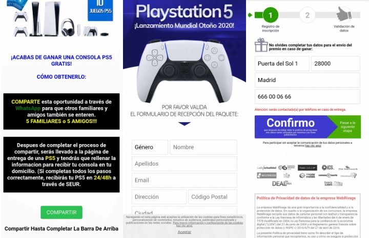 El primer apartado nos indica que nos mandarán la consola a nuestro domicilio en 24/48 horas a través de Seur. En las siguientes, donde nos piden una serie de datos personales, y ahí está el problema. Tras facilitar nuestro nombre completo, email, número de teléfono y hasta dirección física, nos comenzarán a aparecer todo tipo de ofertas y publicidad. Pero ojo, con nuestros datos habrá ciberataques que pueden servir para estafarnos.