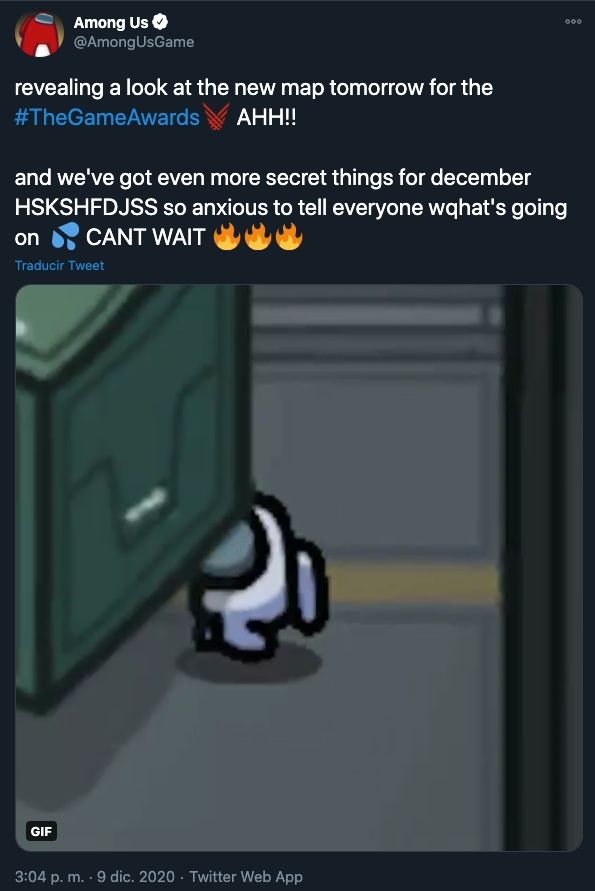 La cuenta de Twitter Among Us, que se ha convertido en una gran presencia en la plataforma de redes sociales, tuiteó sobre la inminente revelación del mapa esta semana, el día antes de The Game Awards. Un gif errático de Among Us fue acompañado con el adelanto de lo que vendrá más allá de la revelación del mapa, pero aún no sabemos cuáles podrían ser esas sorpresas.