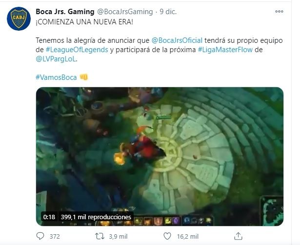 "Tenemos la alegría de anunciar que @BocaJrsOficial tendrá su propio equipo de #LeagueOfLegends y participará de la próxima #LigaMasterFlow de @LVPargLoL", escribieron.