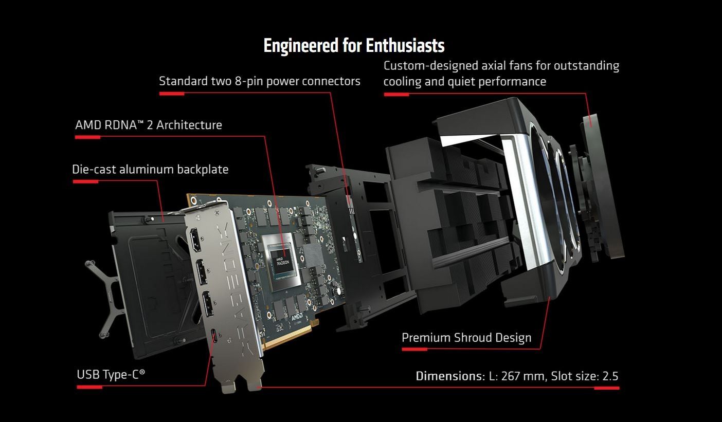 Su arquitectura de juegos AMD RDNA 2, la cual fue diseñada para impulsar la próxima generación de PC de escritorio, portátiles, consolas y juegos móviles y que es un 54% más de rendimiento por vatio en comparación con la primera generación de la arquitectura en el nodo de proceso de 7nm.