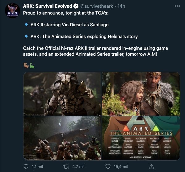 La secuela del exitoso juego de supervivencia de dinosaurios Ark: Survival Evolved se anunció en The Game Awards con un avance cinematográfico extendido que presentaba dinosaurios, un niño lindo y muchos gruñidos de Vin Diesel.