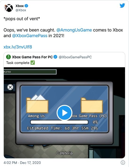 Microsoft compartió la noticia en un retweet de un video que publicó la cuenta de Twitter de Xbox Game Pass para PC para celebrar la incorporación de Among Us al servicio de suscripción. Posteriormente, la compañía actualizó su publicación de blog original sobre la disponibilidad de Xbox Game Pass para PC del juego para confirmar la noticia.