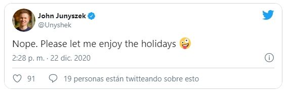 La confirmación llega por parte de John Junyszek, Community Manager del estudio, quien respondió a un usuario en su cuenta de Twitter. "No. Por favor déjame disfrutar de mis vacaciones", expresa el comentario.