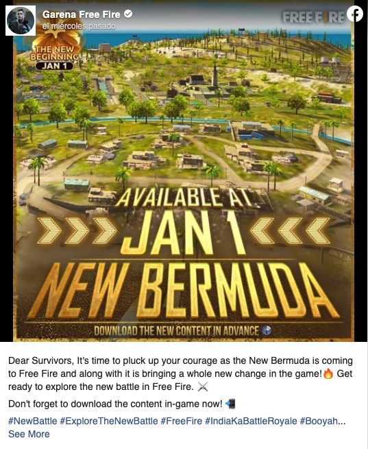 "Estimados supervivientes: ¡Es hora de animarse, ya que New Bermuda llega a Free Fire y, junto con ello, trae un cambio completamente nuevo en el juego! Prepárense para explorar la nueva batalla en Free Fire. ¡No olvides descargar el contenido del juego ahora!"