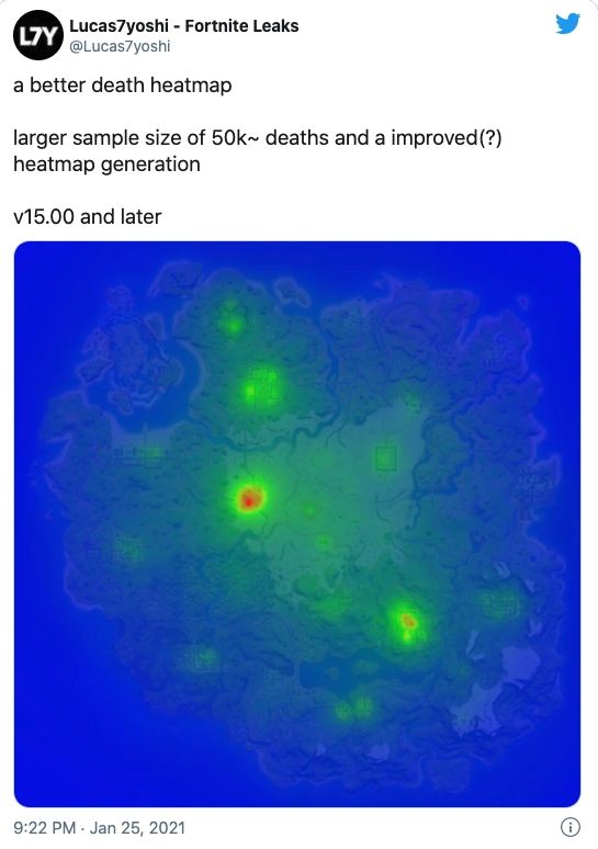 Lucas7yoshi ha publicado una imagen que cuenta con precisión dónde están siendo eliminados los jugadores. Según la imagen, las áreas que están en azul están algo inactivas, mientras que las áreas verdes y rojizas notan un mayor número de jugadores.