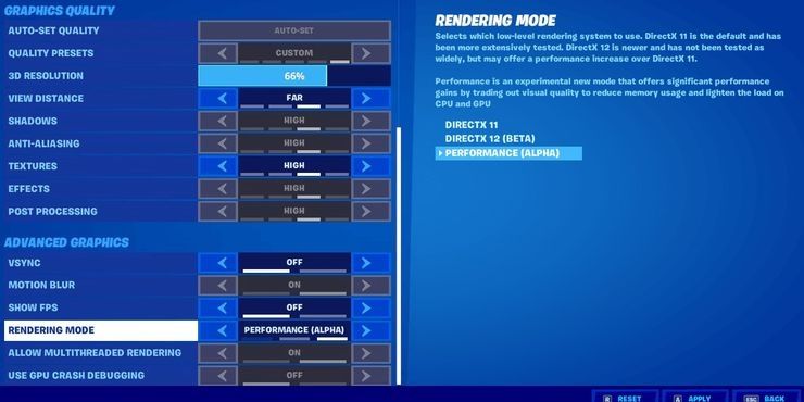 El modo de rendimiento en Fortnite se puede habilitar y deshabilitar a través del menú de configuración del juego. Desplázate hacia abajo, hasta Rendering Mode y selecciona Rendimiento (Alfa). A continuación, se les pedirá a los jugadores que reinicien el juego. El modo de rendimiento se habilitará al volver a cargar Fortnite. A los jugadores con hardware de gama baja se les pedirá que habiliten el modo de rendimiento cuando inicien el juego.