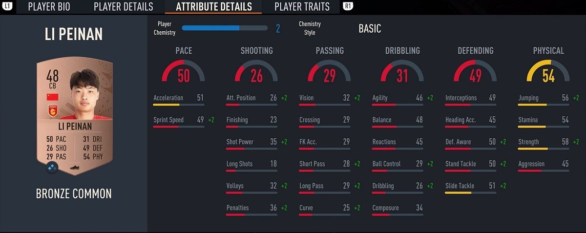 Li Peinan cuenta con un 58 en fuerza (lo cual no está nada mal), pero lo echa por tierra por sus malas estadísticas de robos (49), resistencia (34) y posicionamiento (26).