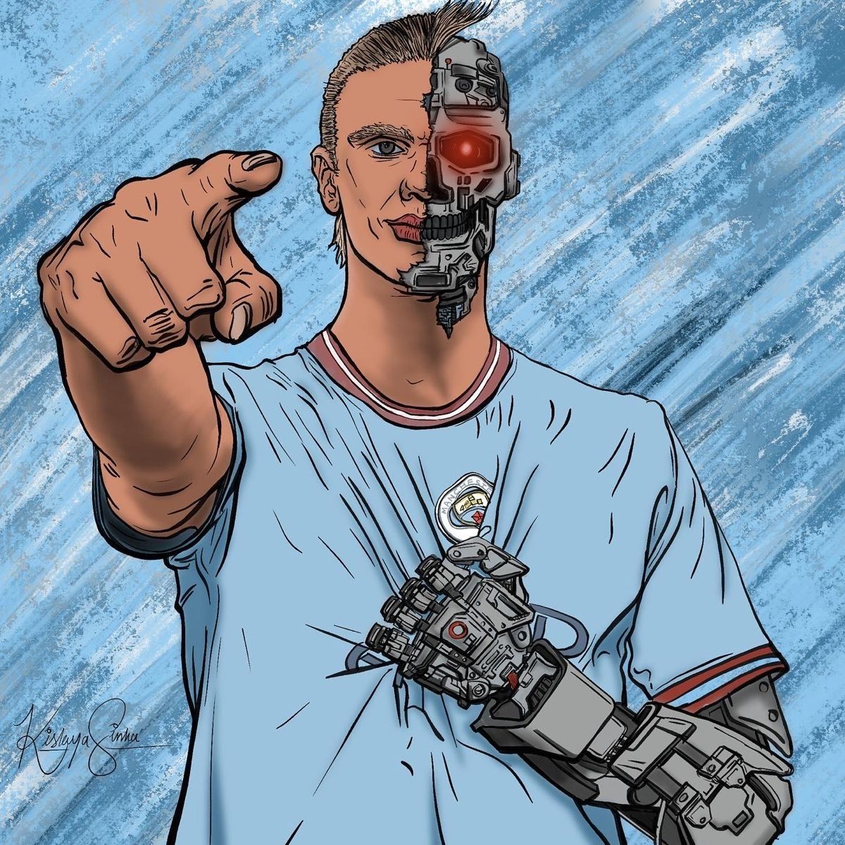 Aunque él mismo ha compartido postales en las que aparece como vikingo, androide o robot, el jugador del City reconoció públicamente que el sobrenombre que más le agradaría que quedará como el oficial es "Terminator". Aquí el usuario de Pinterest Kislaya Sinha ha homenajeado al delantero del City al crear a Haaland Terminator.