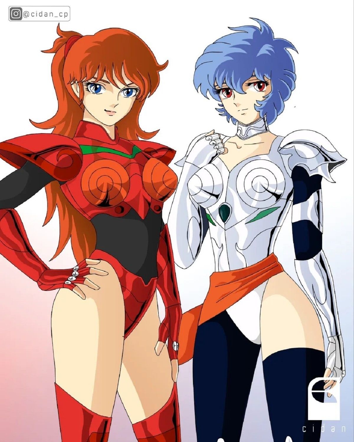 Si bien en la imagen no se describe qué tipo de armaduras son, la ilustración imagina a Asuka y Rei en sus trajes de piloto al estilo Caballeros del Zodiaco.