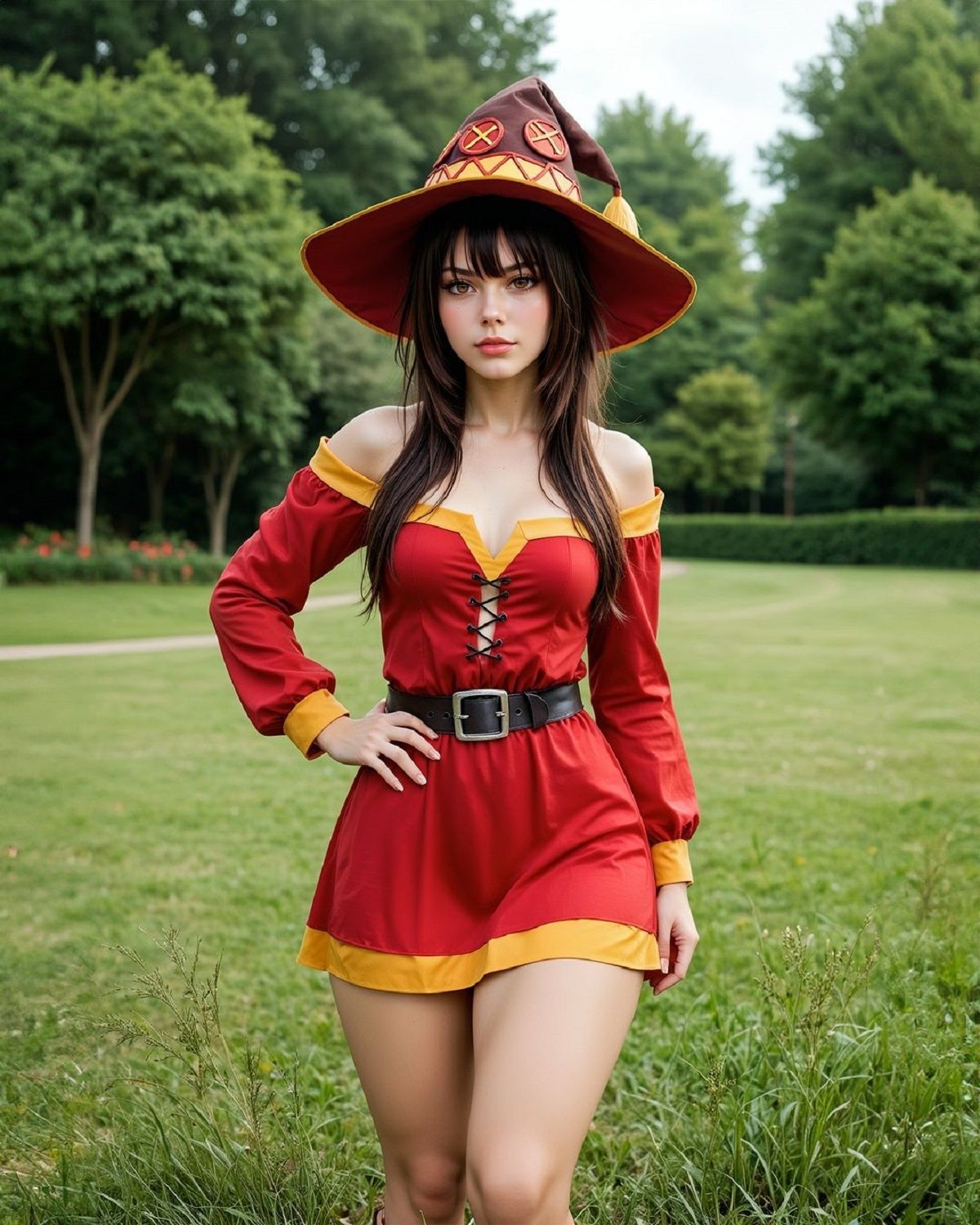 En la interpretación de la IA, Megumin aparece con su icónico sombrero de mago, una capa oscura y una túnica roja que contrasta con sus ojos intensamente rojos. El cabello oscuro y corto, un sello distintivo de los Demonios Carmesí, está perfectamente representado. El toque realista hace que la piel y los detalles faciales de Megumin luzcan mucho más naturales, pero conservando esa chispa de determinación y energía que la caracteriza en el anime.
