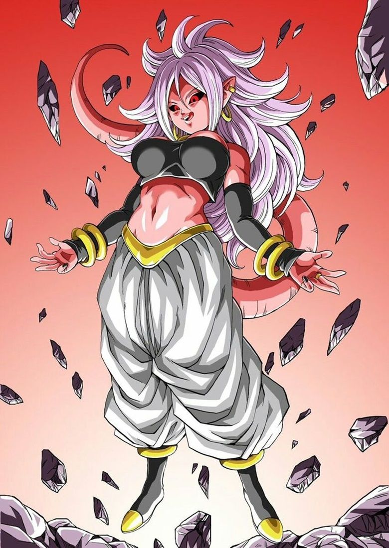 Androide 21 es una creación posterior del Dr. Gero, desarrollada a partir del ADN de múltiples guerreros y villanos, incluyendo Majin Buu, Freezer y Cell. Su historia es profundamente trágica, ya que lucha constantemente con su lado humano, brillante y compasivo, y su naturaleza Majin, que la impulsa hacia el caos y la destrucción. En el videojuego Dragon Ball FighterZ, su búsqueda para comprenderse a sí misma la lleva a enfrentarse tanto a los héroes como a los villanos del universo Dragon Ball Z.