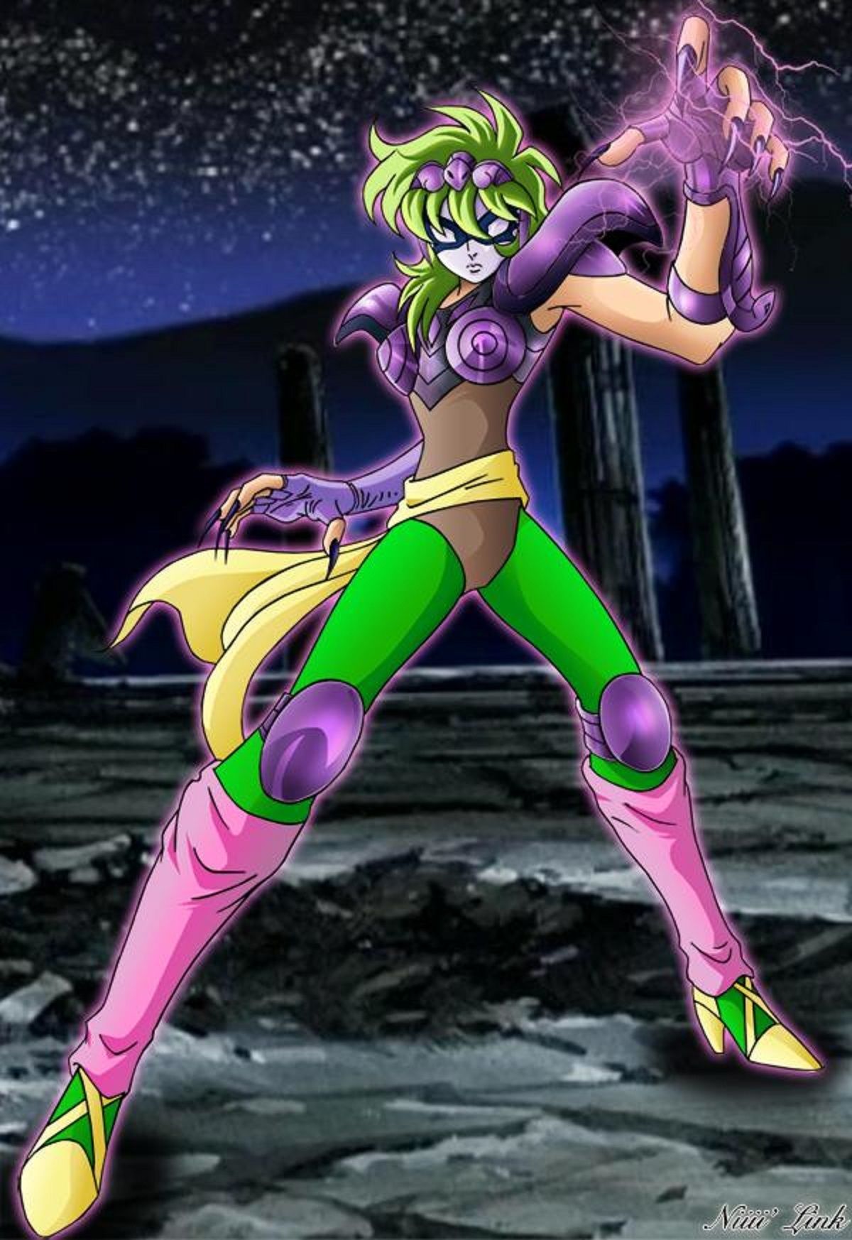 La inteligencia artificial ha añadido un toque distintivo al atuendo de Shaina, vistiéndola con una imponente armadura de color morado. Esta elección de color no solo le confiere un aura misteriosa, sino que también sugiere un simbolismo relacionado con la nobleza y la lealtad, características que definen a Los Caballeros del Zodiaco.