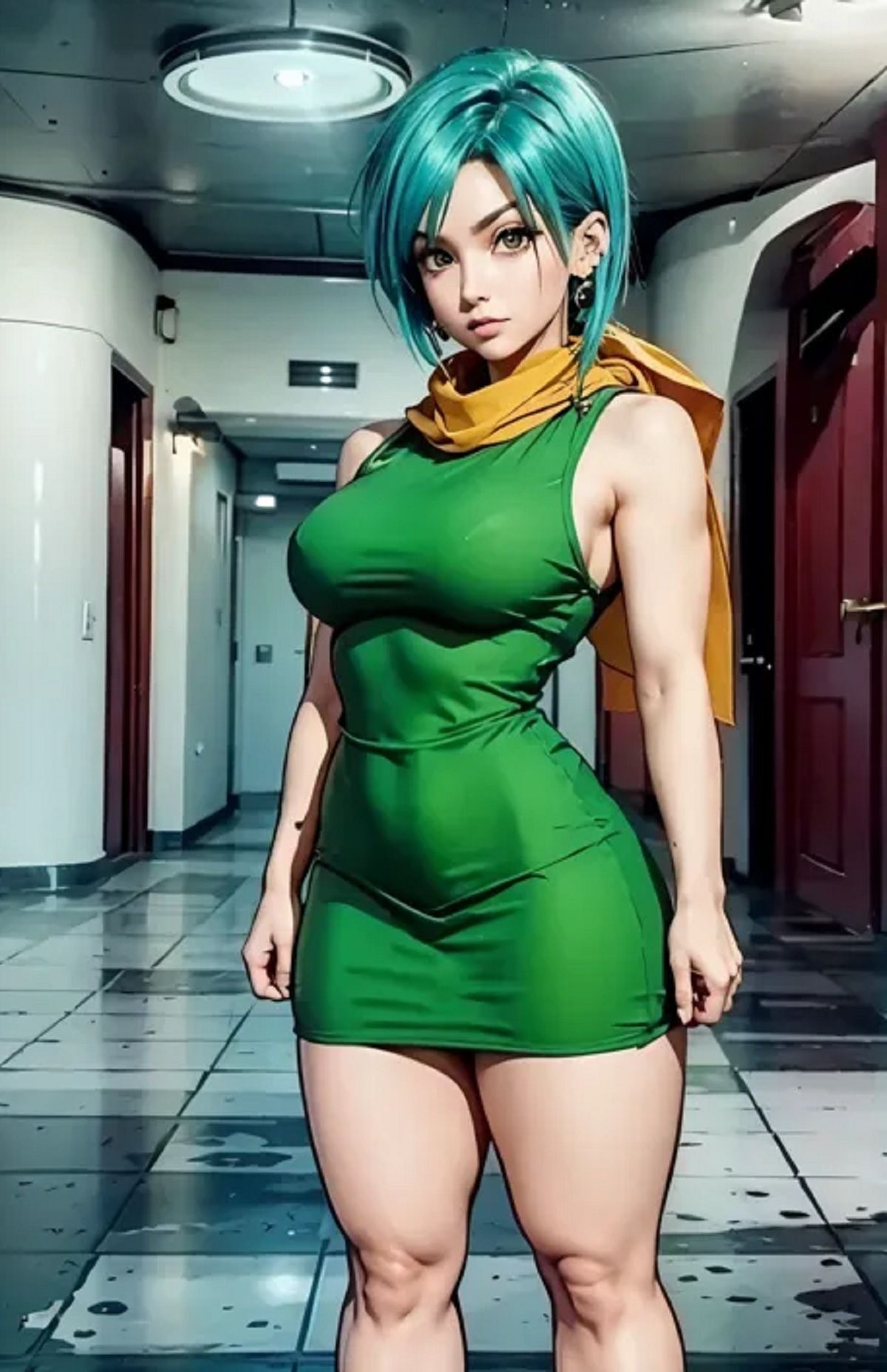 Por otro lado, la Inteligencia Artificial ha creado imágenes de Bulma que rivalizan con el trabajo de los cosplayers. Estas representaciones digitales muestran a Bulma con su distintivo cabello azul verdoso y un vestido rojo clásico. En otra imagen, la IA la viste con un raro vestido verde, ofreciendo una nueva perspectiva sobre su estilo. Cada detalle ha sido meticulosamente diseñado para reflejar la personalidad vibrante y audaz de Bulma.