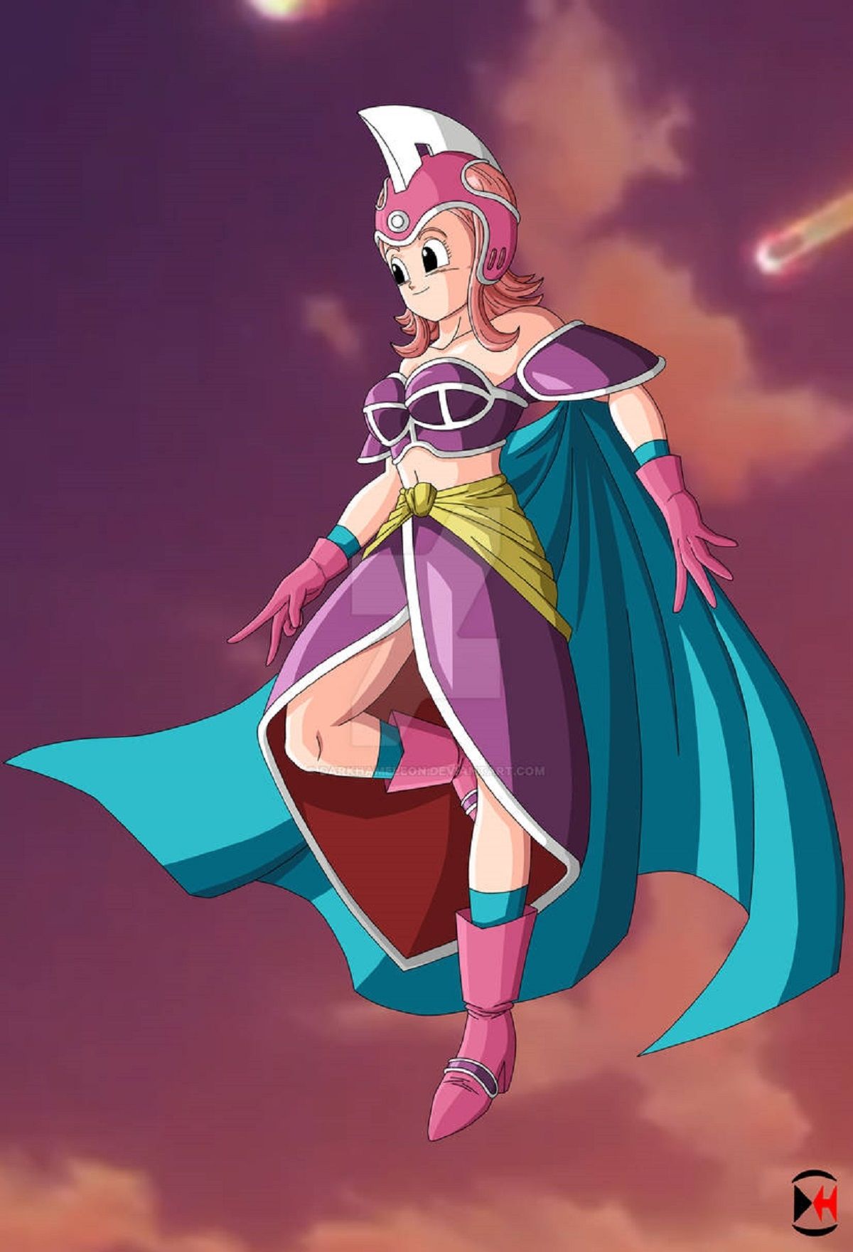 En esta ocasión, el arte de @Camaleón Oscuro destaca por su meticulosa atención al detalle. La fusión de Chronoa y Milk resulta en un personaje que combina los atributos más distintivos de ambas. Chronoa aparece con su tez malva, orejas puntiagudas y cabello rosa salmón que llega justo por debajo del cuello. Viste la clásica camiseta sin mangas de cuello alto en color gris pizarra oscuro, sobre la cual lleva el traje tradicional de los Kaioshin en tonos rosados con mangas blancas, un pañuelo amarillo pastel alrededor de la cintura, pantalones morados y botas blancas de tacón alto.