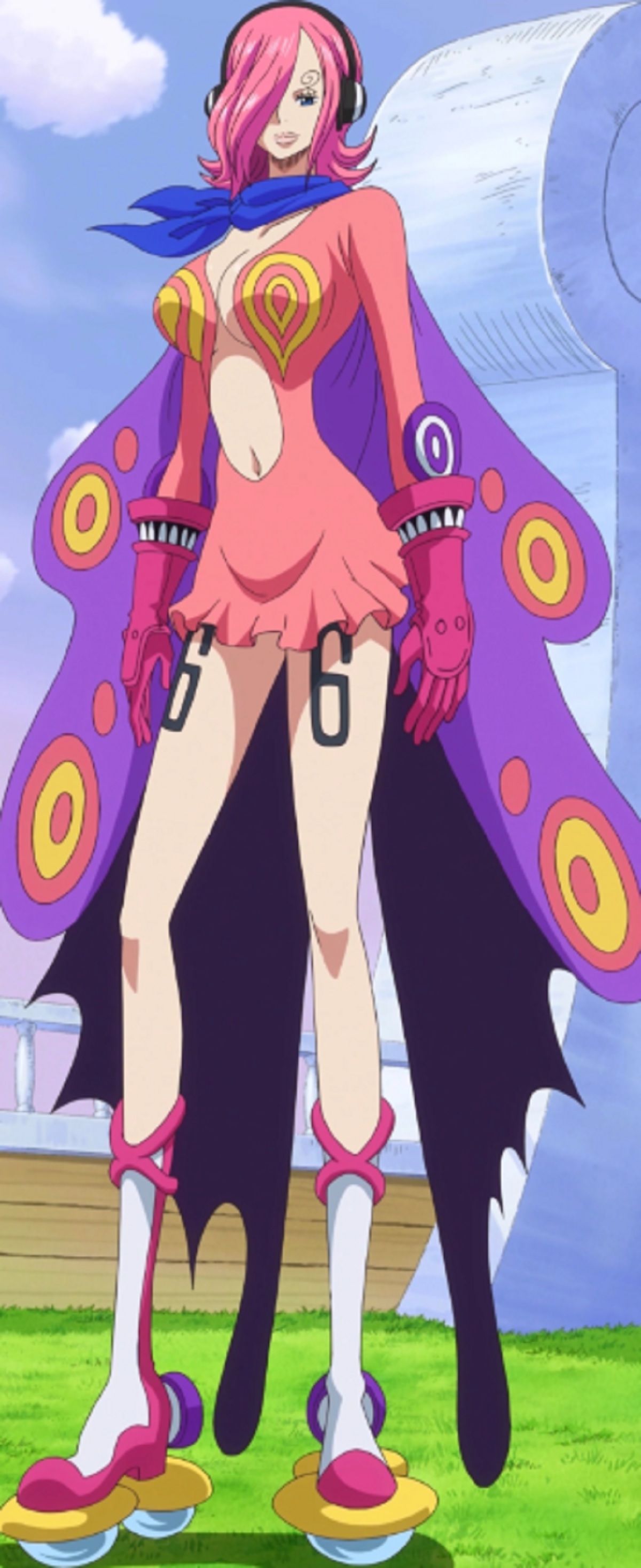 En las imágenes compartidas por la cosplayer y usuaria de Facebook @ashecosplays, se puede apreciar el realismo de cada detalle. El atuendo de Ashari es bastante similar al que porta Reiju en One Piece, consistiendo en un vestido de manga larga color rosa con patrones dorados en forma de dianas, descubierto desde el frente hasta el ombligo. También tiene una capa morada con dorado en la espalda y unas orejeras en la cabeza, además de lucir su característico cabello corto y rosa.