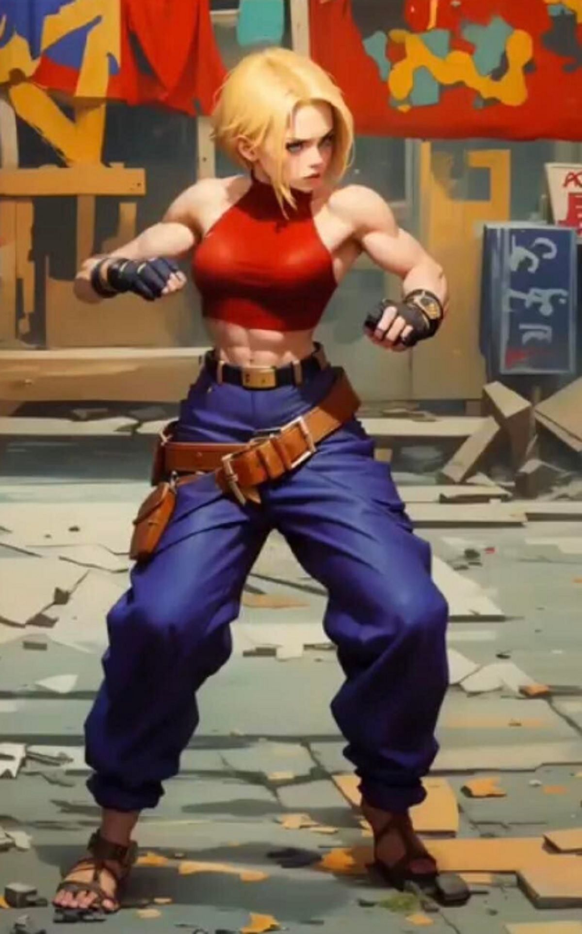 Por otro lado, la inteligencia artificial no se ha quedado atrás. El usuario de Instagram My Smart Art ha utilizado herramientas avanzadas para traer a Blue Mary a la vida digital. Las imágenes generadas por IA presentan una versión moderna de Mary, manteniendo su esencia original. En esta recreación, Blue Mary aparece como una joven atlética y de piel bronceada, con una figura curvilínea que refleja su intenso entrenamiento en artes marciales. Su cabello largo, rubio y ondulado, y sus ojos azules claros, combinan perfectamente con su vestimenta deportiva. Al igual que en la versión de jubyheadshot, esta versión digital también incorpora los colores vivos y los elementos americanos distintivos del personaje.