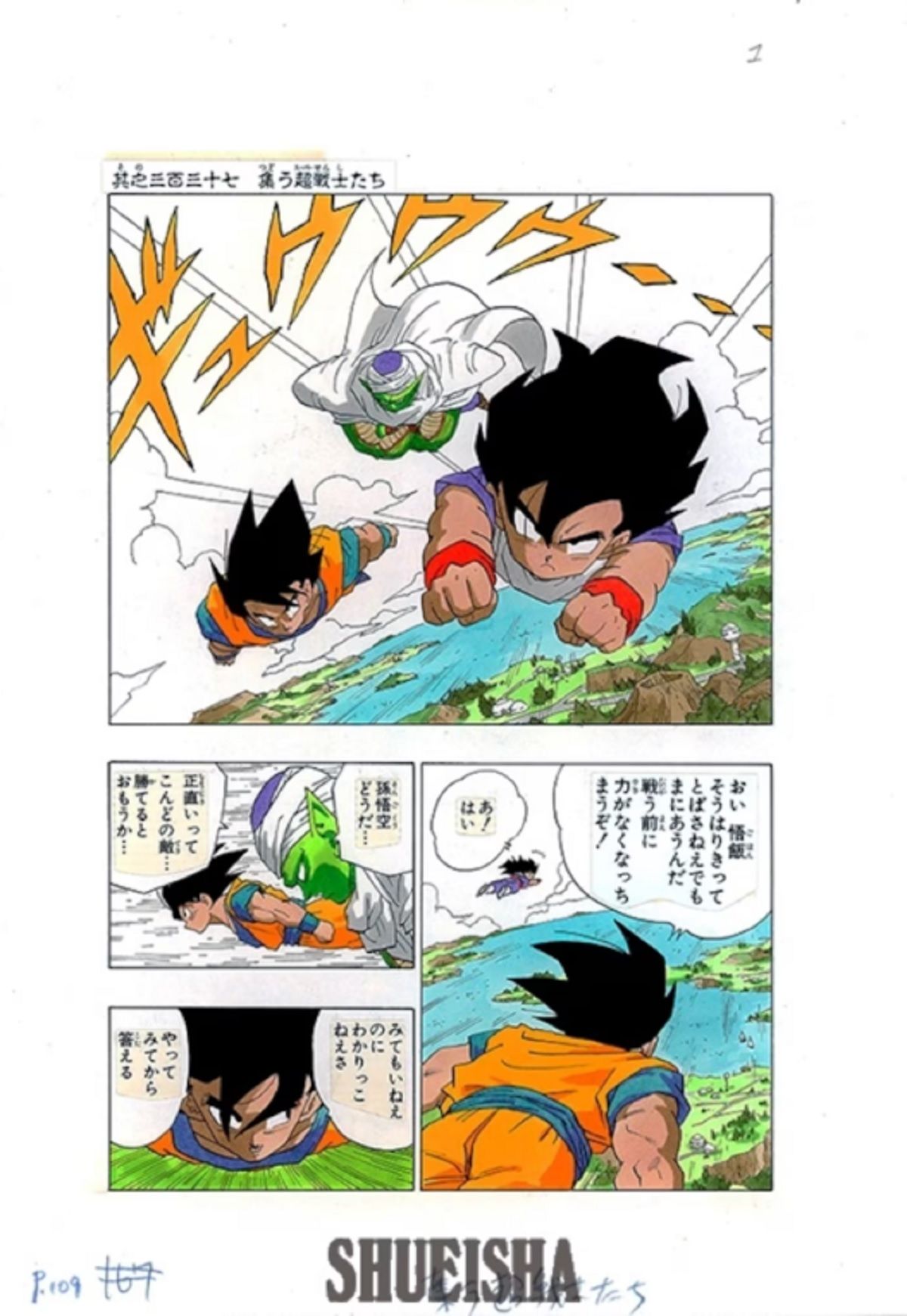 “Esta espectacular página a color muestra a Gohan y los demás corriendo hacia la Isla del Sur para enfrentarse a los androides. El uso del color realmente le da vida a la sensación de velocidad explosiva de esta imagen. Por cierto, en el momento de la publicación, el cielo estaba coloreado de azul como parte del proceso de impresión”, explicó la página oficial de Dragon Ball al presentar este archivo.