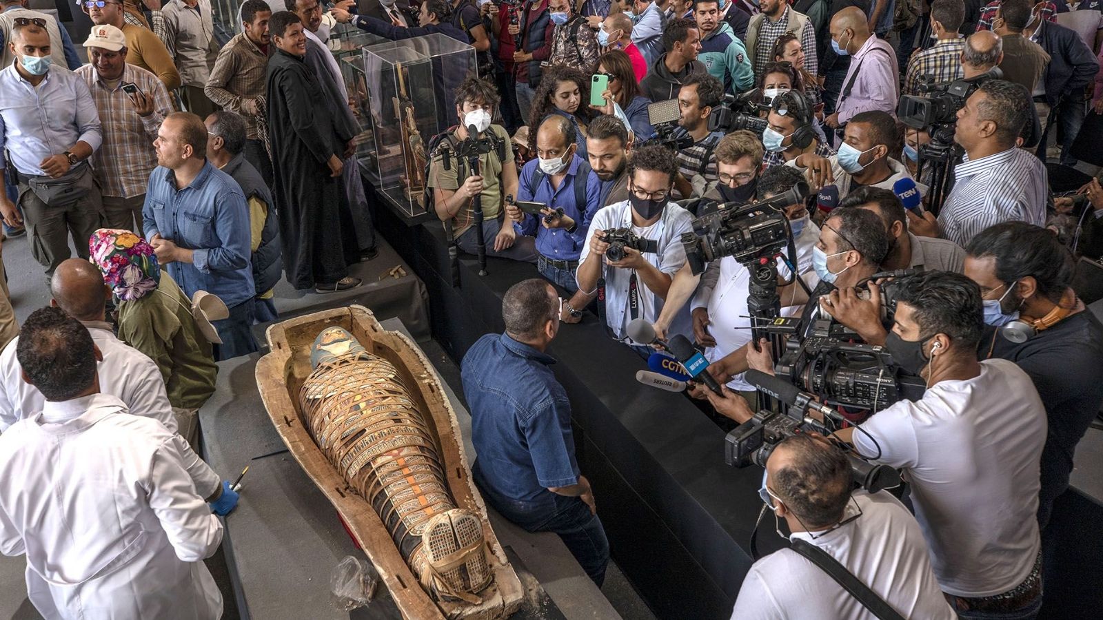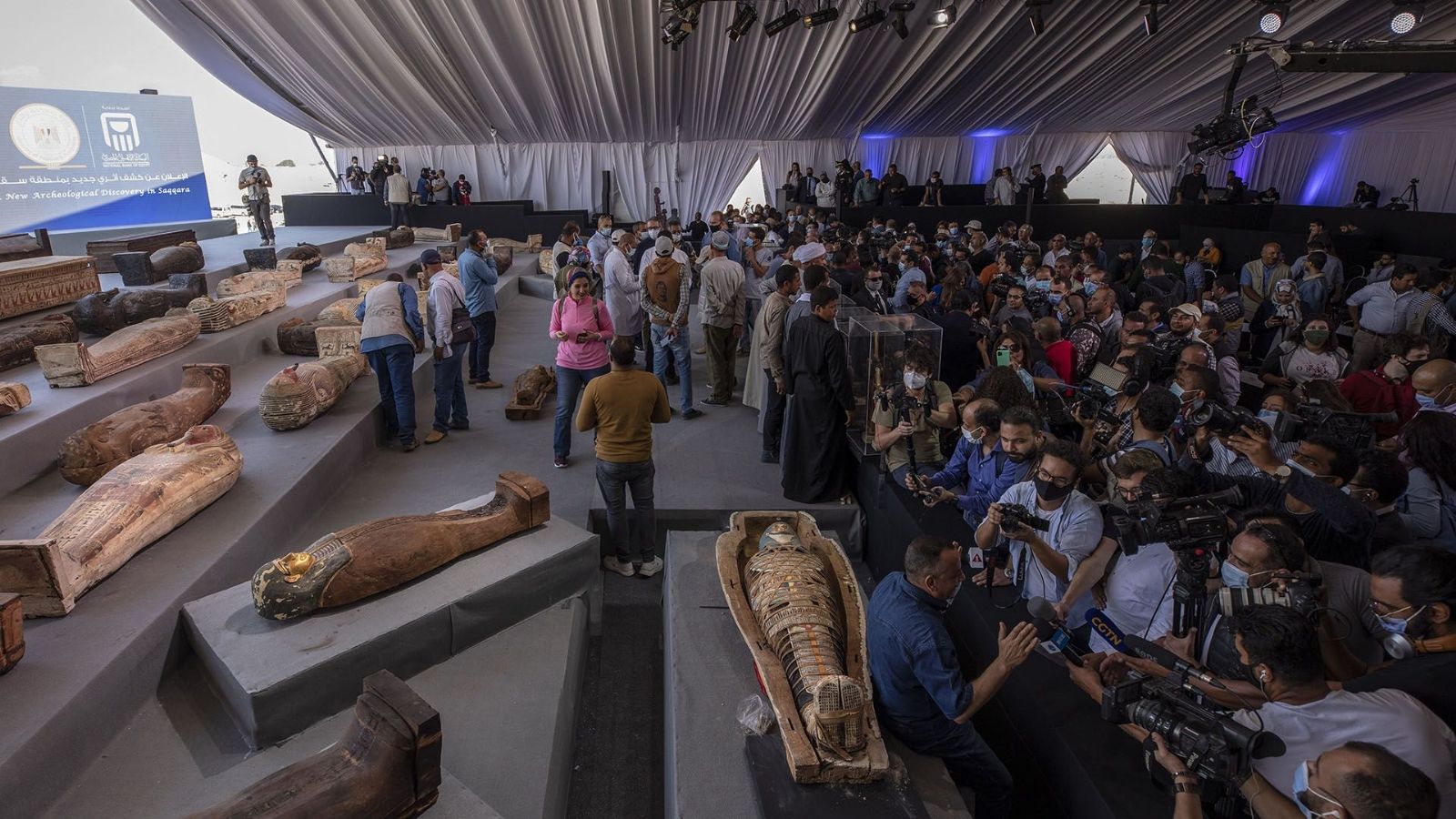 Más de la mitad de los 59 sarcófagos descubiertos en octubre yacían ante la muchedumbre, cubiertos con una tela, tras permanecer más de 2.500 años bajo las arenas del Bubasteum, el área del sitio arqueológico de Sakkara dedicado a la diosa gata Bastet, garante del amor y la protección.