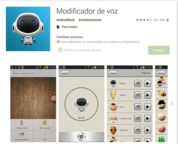 La primera se llama “Modificador de Voz” es es una aplicación exclusiva de Android y que podremos conseguir a través de Play Store. Al abrir la app, deberemos grabar nuestro audio y posteriormente podremos seleccionar el filtro que queremos usar. Hay distintas opciones: robot, extraterrestre, ardilla, demonio, entre otras. Una vez modificado el audio, solo nos faltará enviarlo a nuestro contacto.