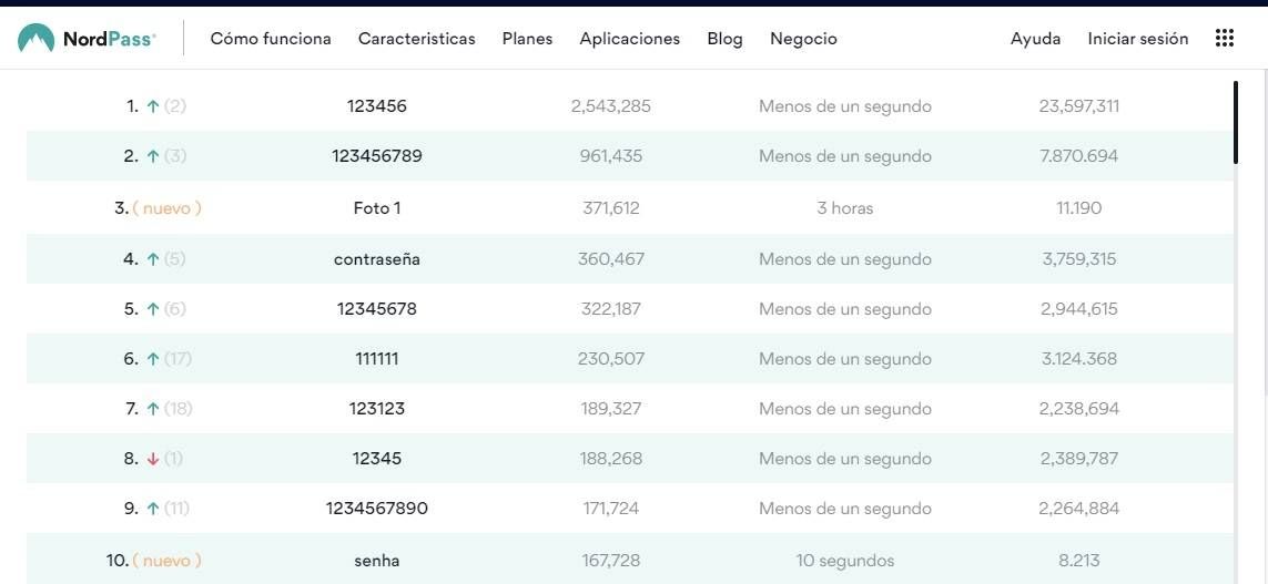 Los primeros diez lugares de las contraseñas más utilizadas son los siguientes: