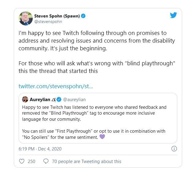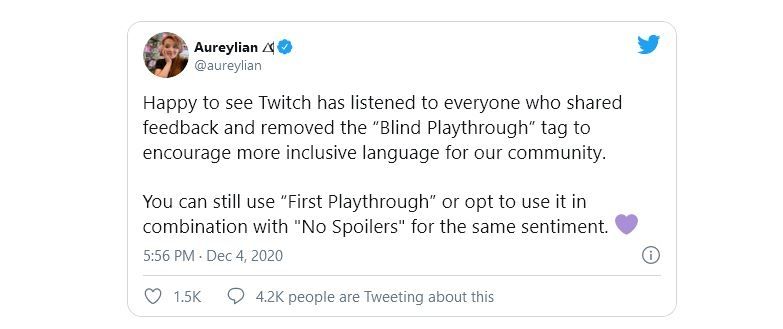 En un posteo desde Twitter, explicó que “me alegra ver que Twitch ha escuchado a todos los que compartieron feedback y ha eliminado el tag “blind playthrough” para animar a la comunidad a usar lenguaje más inclusivo”.