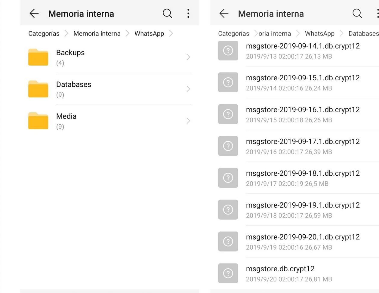 Buscar en el dispositivo la carpeta llamada WhatsApp y en ella ir a la que se llama Databases, donde se encuentra el archivo “msgstore.db.crypt12”.