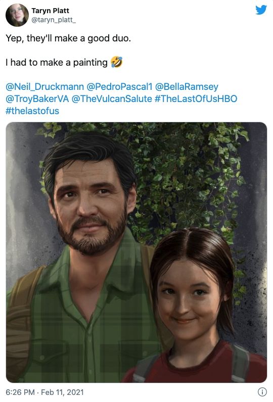 Otro fanart que se destacó, y que muestra a Pascal junto a su coprotagonista Bella Ramsey (quien será Ellie), es la obra del artista Taryn Platt. El resultado, como vemos, es notable y guardan mucho parecido con los personajes del juego.