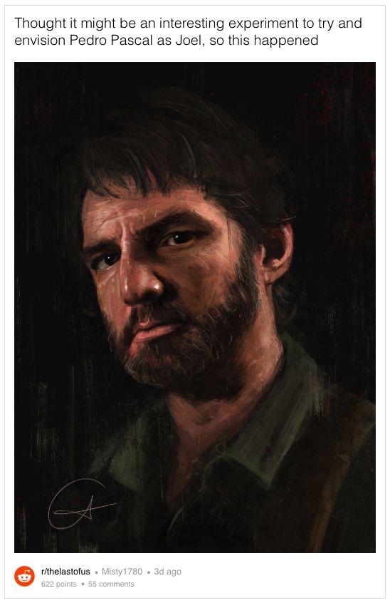 Si bien circuló mucho fanart sobre cómo lucirá el actor, lo que más repercutió fue una pintura de la artista croata Andrea White. Una versión de Pascal con la barba de Joel y un estilo desaliñado, además de unas logradas marcas en la cara, producto de su paso por el mundo post apocalíptico del título.