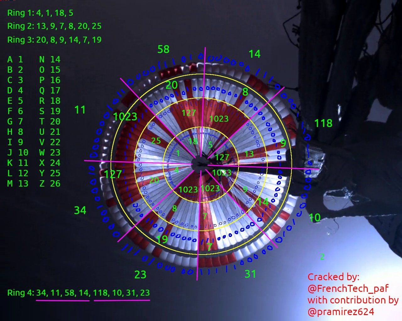 Cada uno de los anillos concéntricos en el patrón del paracaídas representa una de las palabras. Los 0 y 1 deben dividirse de a 10 caracteres, y a partir de eso, se suma 64 y da como resultado el código ASCII de la computadora que, finalmente representa una letra.