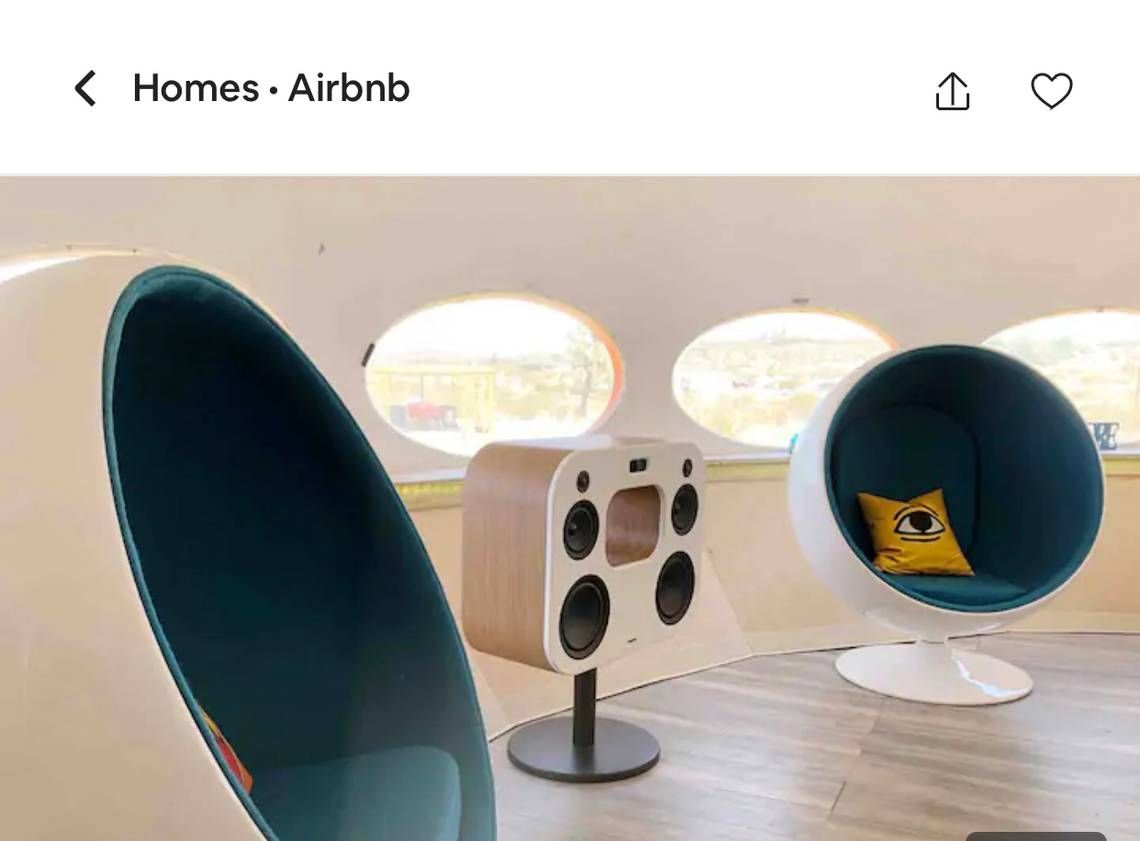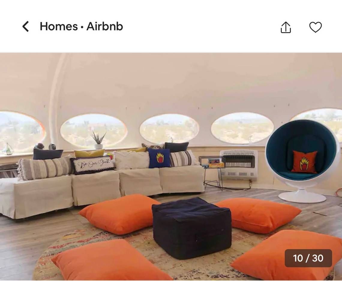 "¡Una Casa Futuro original restaurada para la mejor experiencia de Glamping!" dice el listado. "¡Solo hay 85 en el mundo, 19 en los EE. UU., Y solo 1 disponible en el que puede pasar la noche y ese es el AREA 55 en Joshua Tree CA!"
