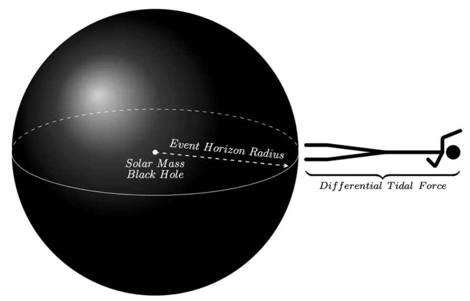 Por lo tanto, alguien que caiga en un agujero negro de tamaño estelar se acercará mucho más al centro del agujero negro, antes de pasar por el horizonte de eventos. La fuerza sobre una persona diferirá en un factor de 1000 billones de veces entre la cabeza y los pies. Esto haría que la persona tome una forma larga y delgada, similar a un fideo y con pocas probabilidades de sobrevivir.