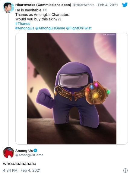 En esta ocasión, el usuario de Twitter Hkartworks, creó una imagen de Thanos llevado al universo Among Us y los fanáticos estallaron. Con su caracteristico púrpura, amenazante e incluso equipado con el guante infinito, el malvado villano de Marvel encaja perfectamente con el de un temible impostor a bordo de la nave.