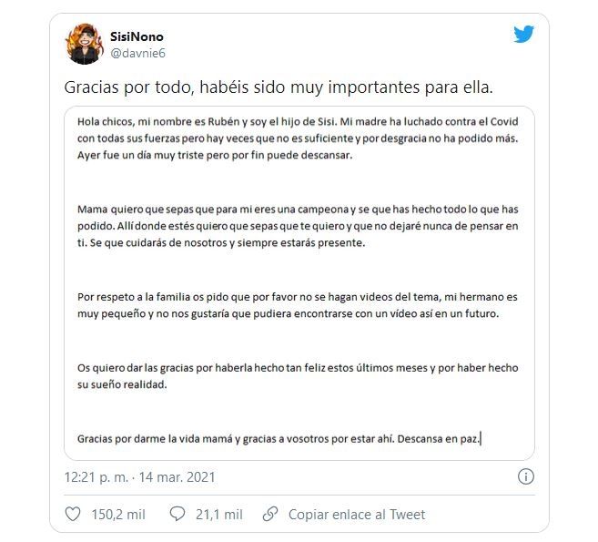 Su hijo fue el encargado de confirmar esta impactante noticia en las redes sociales: "Hola chicos, mi nombre es Rubén y soy el hijo de Sisi Nono. Mi madre ha luchado contra el COVID con todas sus fuerzas pero hay veces que no es suficiente y por desgracia no ha podido más".