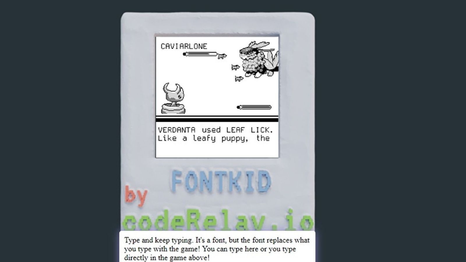 Jugar a Fontemon es tan simple como escribir, ya sea en la página web del juego o en su propio procesador de texto o editor de imágenes con una versión descargable de la fuente . Sin embargo, la forma más fácil de avanzar en la historia es no intentar escribir de forma coherente. El juego avanzará a través de los hitos habituales de Pokémon de recibir un monstruo inicial y dirigirse a sus primeras batallas en el gimnasio con una serie de personajes sin sentido. Solo asegúrate de escribir las letras correctas una vez que estés en una batalla. Por supuesto, si te equivocas o pierdes, también puedes presionar la tecla de retroceso para deshacer tu error.