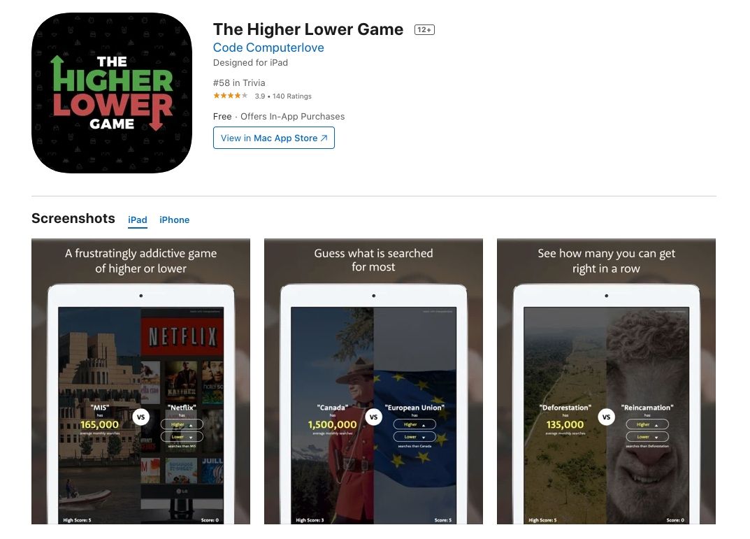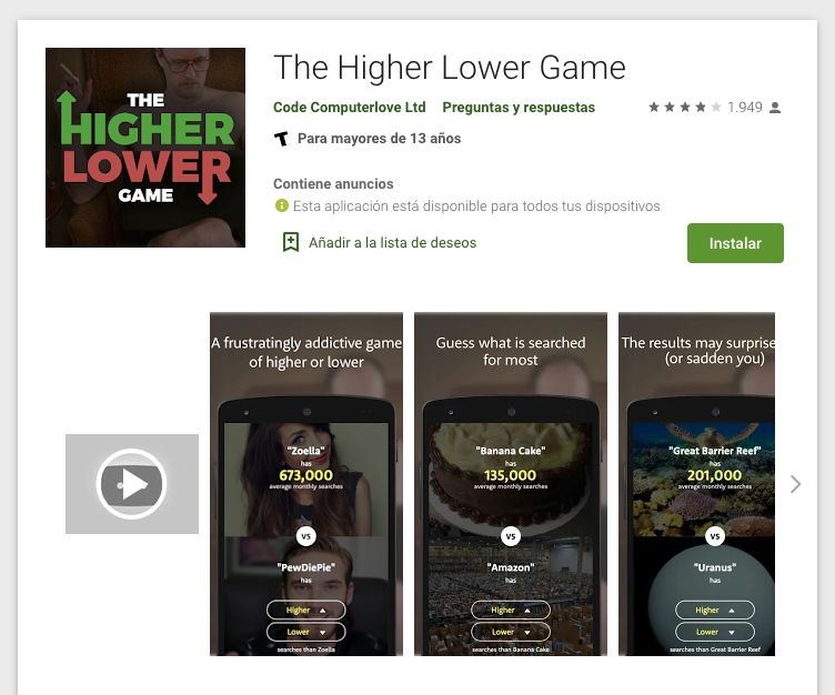Higher or Lower ha, realmente, arrasado en España. Es un sencillo videojuego de preguntas que puede jugarse en la web o ser descargado para Android, Apple o Amazon.